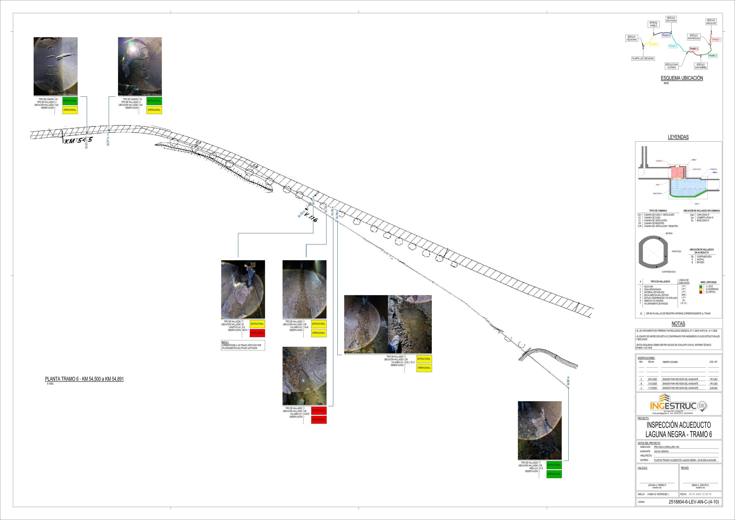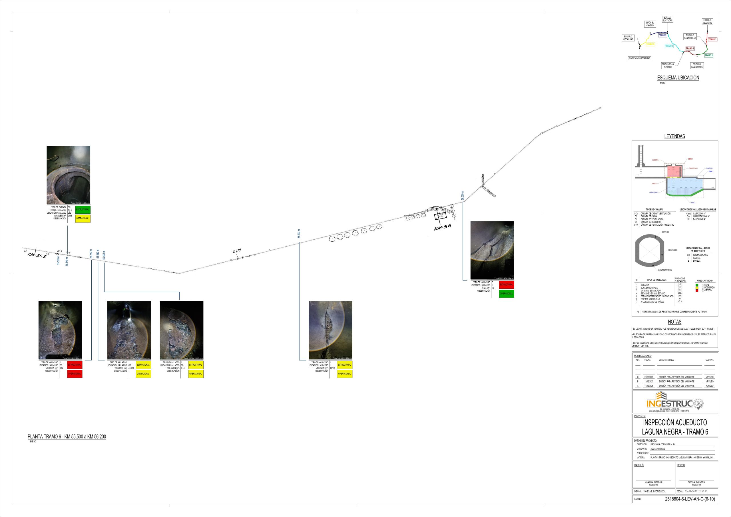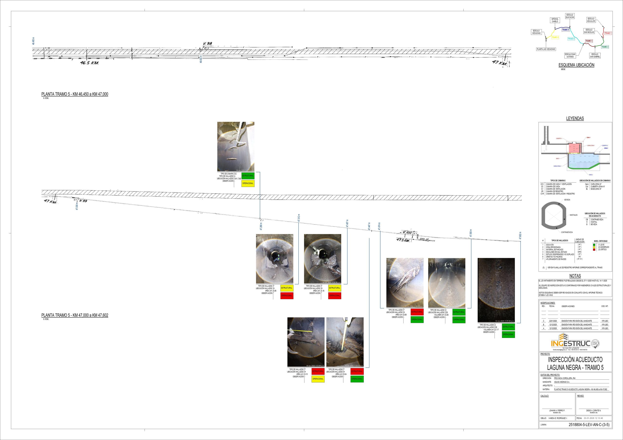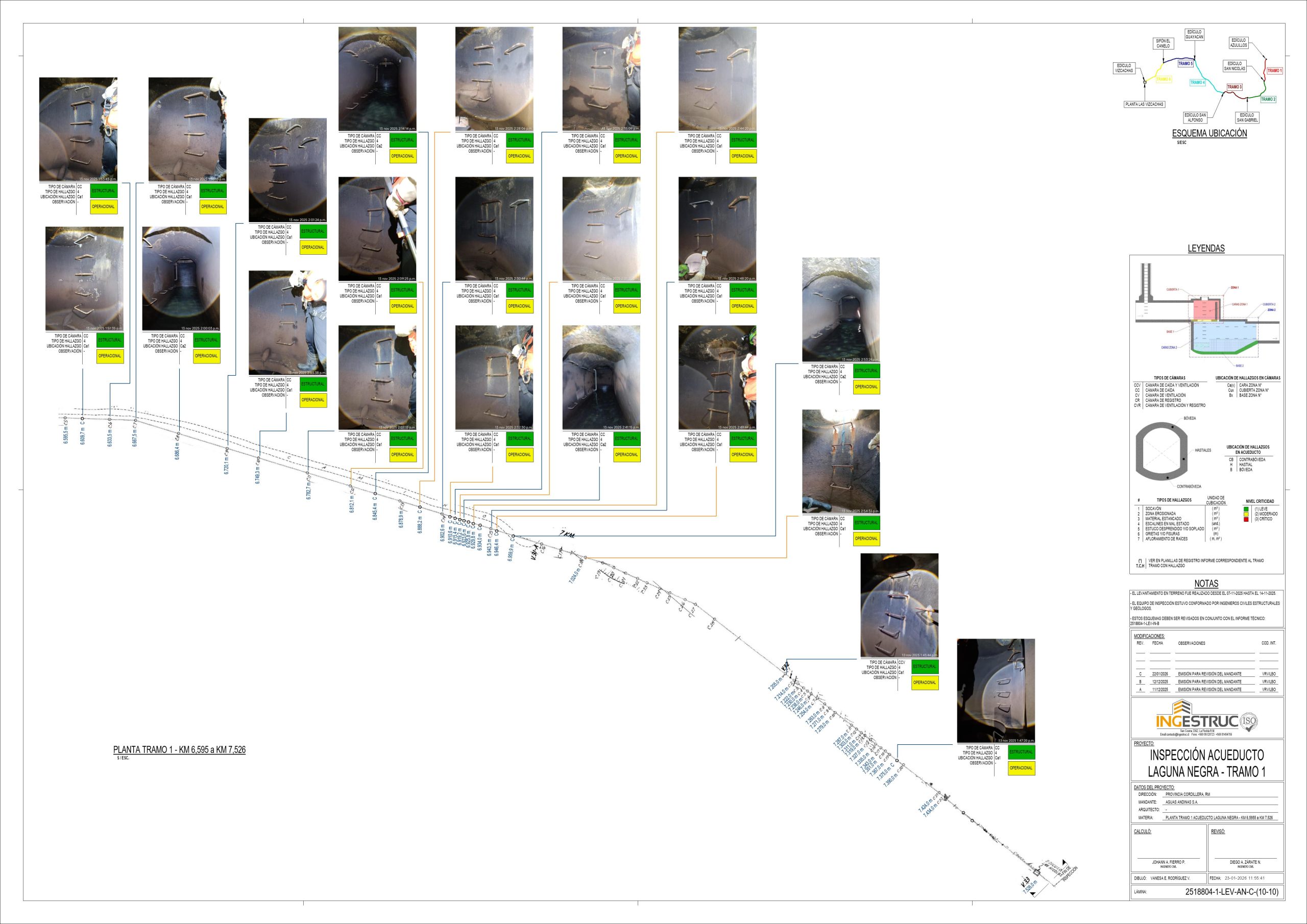 El proyecto consistió en la Inspección Técnica del Acueducto Laguna Negra, abarcando el recorrido de aproximadamente 30 kilómetros del conducto subterráneo, el cual posee 1.5 metros de altura e incorpora tramos planos y cámaras de caídas y ventilación. La inspección en terreno se enfocó en la visualización, fotografía y detallado de hallazgos críticos como socavones, zonas erosionadas, afloramiento de vegetación, entre otros. Finalmente, el equipo analizó la información para determinar la geolocalización, la criticidad estructural y operacional de cada anomalía, además de las cantidades y cubicaciones necesarias, lo que permite a Aguas Andinas establecer un cronograma de reparaciones priorizado y efectivo.